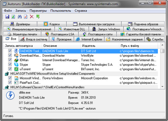 Это средство проверяет большее количество мест, из которых происходит автозапуск программ, чем любой другой монитор автозагрузки. Оно показывает, какие программы настроены на запуск в процессе загрузки или входа в систему, причем эти программы отображаются в том порядке, в каком система Windows обрабатывает их. Такие программы могут находиться в папке автозагрузки или быть прописаны в разделах реестра Run, RunOnce и других. Средство Autoruns можно настроить на отображение и других расположений, таких как расширения оболочки проводника, панели инструментов, объекты модулей поддержки обозревателя, уведомления Winlogon, автоматически запускаемые службы и многие другие. Средство Autoruns обладает более широким спектром возможностей, чем служебная программа MSConfig, которая входит в состав Windows Me и XP.