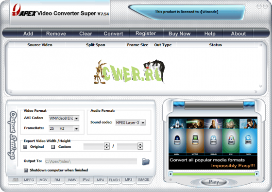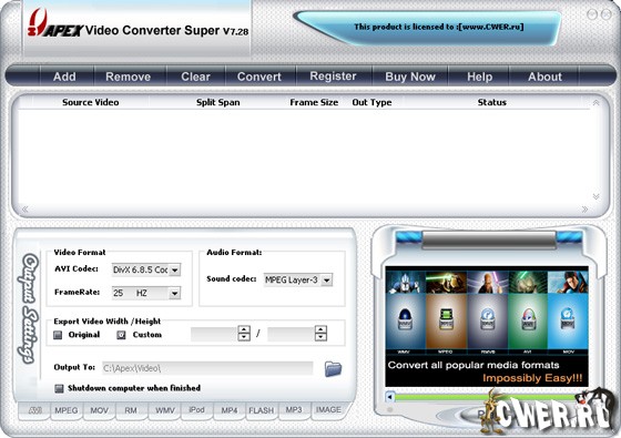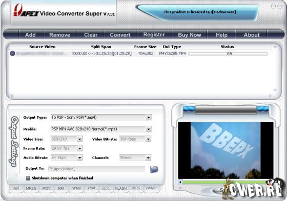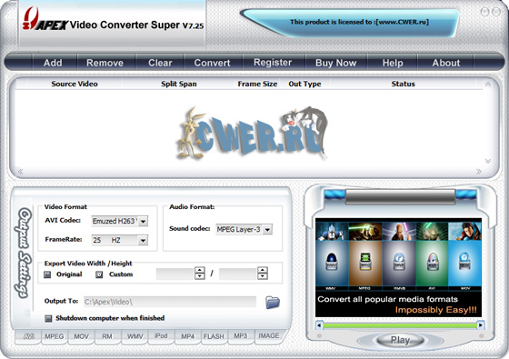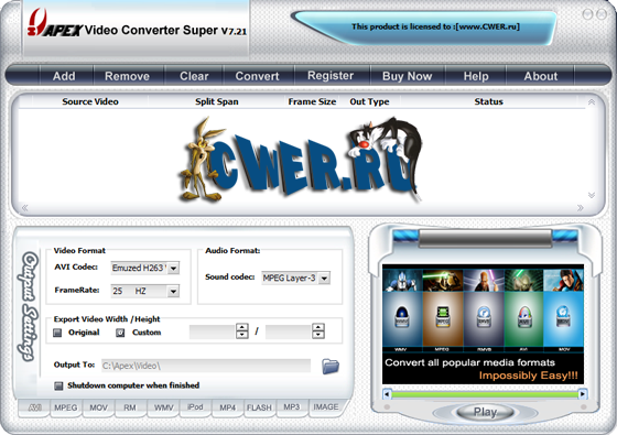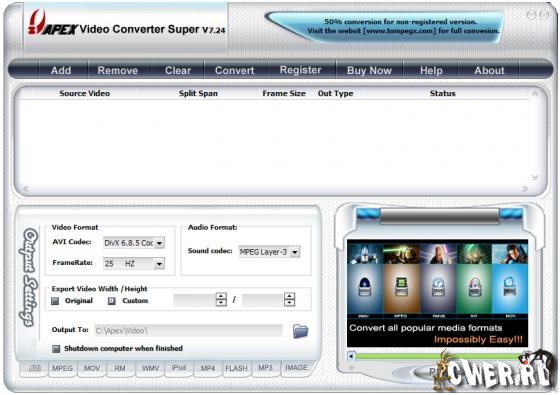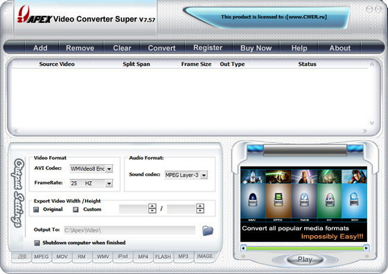 Apex Video Converter Pro - мощный видеоконвертор, позволяющий легко конвертировать видеофайлы из одного формата в другой. Способен конвертировать практически все известные видеоформаты, такие как AVI, DivX, XviD, WMV, ASF, MOV, QuickTime, RM, RMVB, VCD, DVD в MPEG, VCD, DVD, RM, RMVB, WMV, ASF, AVI, DivX, XviD, MOV, QuickTime, Ipod, PSP, Flash SWF, Flash FLV, MP3, WMA. Позволяет конвертировать на высокой скорости без потерь качества, а простой в использовании интерфейс поможет легко конвертировать видеофайлы с функцией предварительного просмотра. Поддерживает видеофайлы большего размера, а также функцию пакетного преобразования.