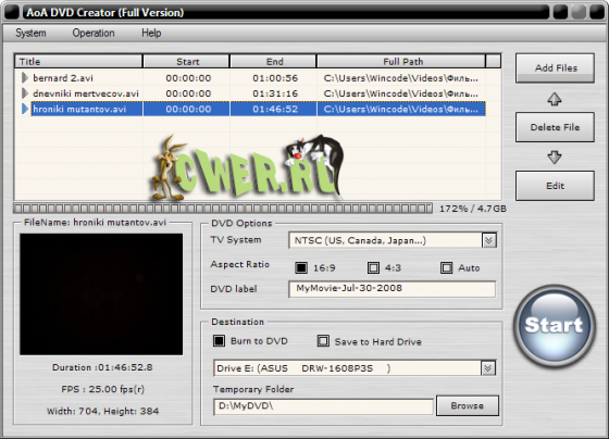 AoA DVD Creator - программа предназначена для создания DVD фильмов из обычных видеофайлов. Обеспечит Вам удобство в создании или преобразовании AVI, WMV/ASF, FLV (Flash Video), MP4, 3GP, MPEG/MPG, DAT и MOV в DVD, которые Вы можете смотреть на вашем домашнем DVD плеере. С AoA DVD Creator Вы сможете легко превратить каникулы, свадьбу и семейные кинофильмы в DVD диски, которые потом можно просматривать вместе с вашими друзьями и семьей!