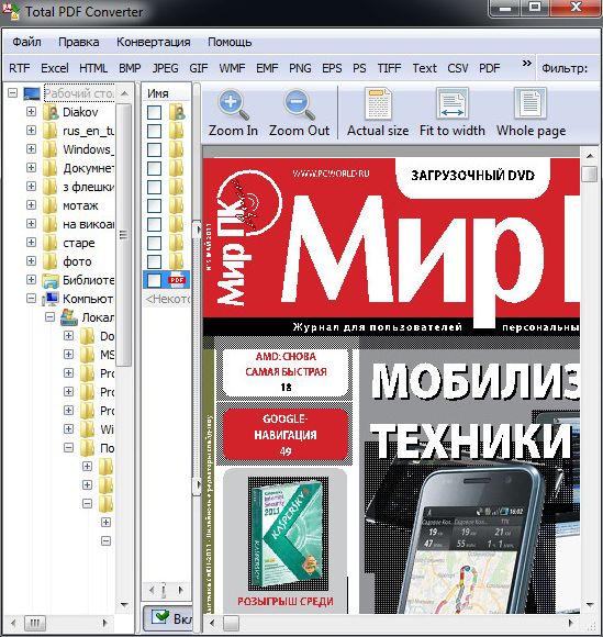 Total PDF Converter преобразовывает PDF в Doc, Excel, HTML, Text, CSV или изображения (TIFF, JPEG). Преимущество этой утилиты в том, что Total PDF Сonverter преобразовывает как отдельный файл, так и множество PDF файлов одновременно. Вам больше не нужен дорогой Adobe Acrobat, наш конвертер сэкономит Ваши деньги. Зарегистрированные пользователи получают командную строку для более эффективной работы с утилитой.