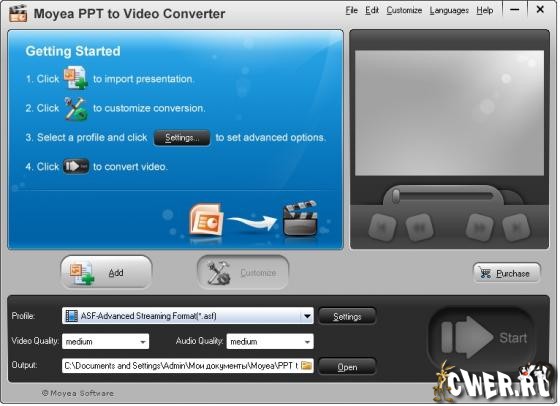 Moyea PowerPoint to Video Converter это профессиональный инструмент для конвертации файлов PowerPoint в видео. Всего 3 щелчка мышью - и ваши PowerPoint файлы будут сконвертированы в видео файлы разнообразных форматов: AVI, WMV, MPEG, MP4, MOV, FLV и 3GP. После конвертации вы сможете просматривать свои презентации как обычные видео ролики.
