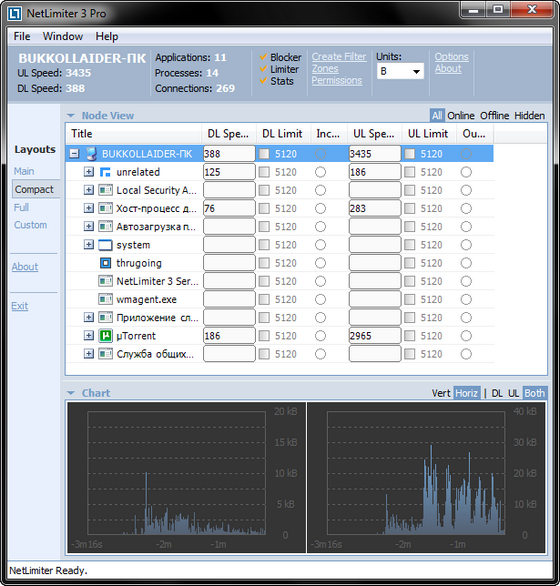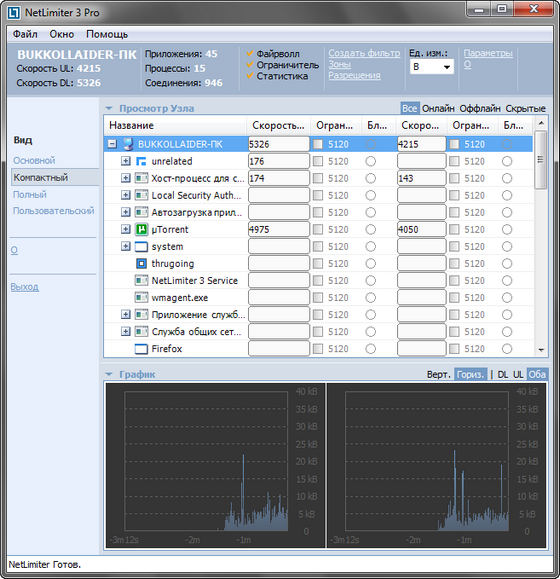NetLimiter Pro - программа, решающая проблему контроля сетевого трафика. NetLimiter следит за деятельностью каждого приложения, использующего доступ к Интернету, а также активно управляет трафиком, контролируя скорость потока данных. Вы можете самостоятельно настроить скорость загрузки и отправки информации для каждого отдельного приложения или соединения. Таким образом, если какая-то программа в ходе своей работы слишком активно потребляет сетевые ресурсы, то у вас есть реальный шанс умерить ее аппетит. Также NetLimiter ведет подробную статистику по всем соединениям, отображая ее в виде графиков или таблиц.