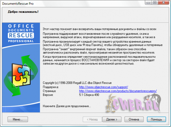 DocumentsRescue Pro - это эффективный инструмент для восстановления документов Microsoft Word, Excel, PowerPoint, Project, Publisher, Visio и других популярных форматов. Программа восстанавливает удаленные файлы, а также копирует нечитаемые файлы с жестких дисков, CD/DVD дисков, КПК, а также всех известных типов флэш-карт (таких как CompactFlash (type I/II), IBM Microdrives, SmartMedia, MultiMedia (MMCs), Secure Digital (SD), Memory Sticks и другие). Способна восстановить документы потерянные в результате: случайного сбоя компьютера, удаления файлов (в том числе когда "Корзина" была очищена), форматирования носителя, и даже в том случае если документ не был сохранен! Программа удобна и проста в использовании даже для новичка, при этом позволяет использовать все возможности восстановления, которые оценят профессиональные пользователи.