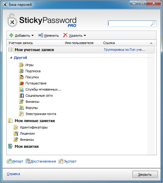 Sticky Password сохраняет и защищает все ваши персональные данные (например, пароли, имена пользователей, номера интернет-пейджеров, контактные данные, номера телефонов и т. д.). Sticky Password связывает пароли и учетные записи с программами Microsoft Windows или веб-страницами, для которых они используются. Вся информация в зашифрованном виде хранится в базе паролей, доступ к которой защищен мастер-паролем. Персональные данные легко доступны, если база паролей разблокирована. После запуска веб-страницы или программы, Sticky Password автоматически вводит пароль, имя пользователя и другие персональные данные. Таким образом, вам достаточно запомнить один пароль и не нужно запоминать остальные.