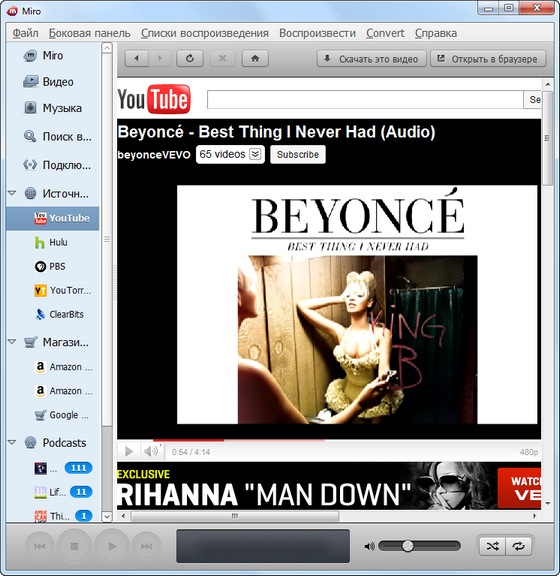 Miro - медиаплеер, основное предназначение которого - облегчение просмотра видео в Интернете. Плеер позволяет подключаться к видео-каналам, загружать видео-файлы на компьютер, просматривать ролики в полноэкранном режиме и т.д. Miro прост в работе и абсолютно бесплатен. Смотрите практически любое видео - Quicktime, WMV, MPEG, AVI, XVID и другие форматы. Просматривайте свою коллекцию, делайте плейлисты, сохраняйте порядок. Подписывайтесь на любые потоки RSS, содержащие видео, подкасты или видеоблоги. Исследуйте сотни свободных каналов при помощи встроенной программы передач.