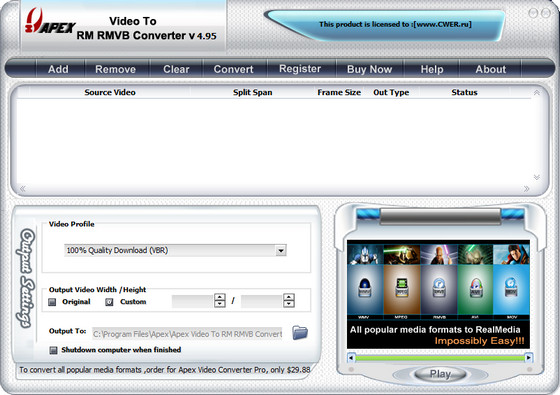 Apex Video to RM RMVB Converter - профессиональный конвертер видео файлов в RM, RMVB форматы, поддержка AVI, DivX, XviD, MPEG, WMV, MOV, ASF, QuickTime и других форматов, пакетный режим конвертирования, вырезка фрагмента из видео файла по меткам времени или фрейму, автоматическое отключение компьютера после завершения конвертирования, выбор и настройка параметров конвертирования, поддержка больших (до 2 Гб) файлов