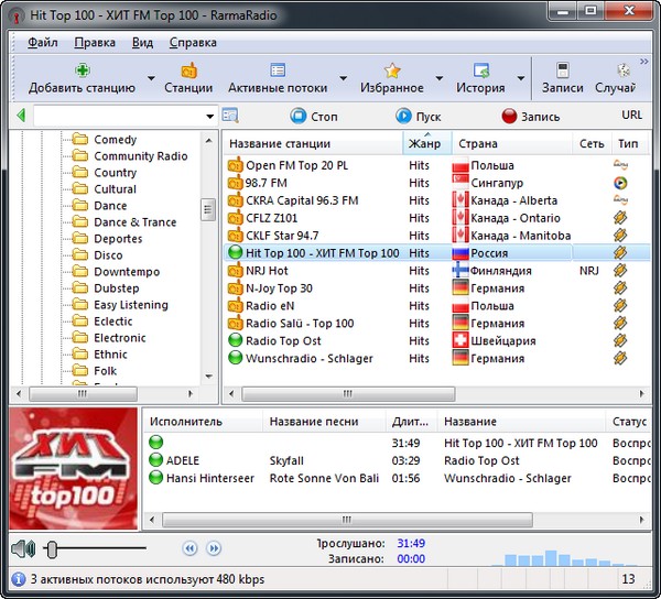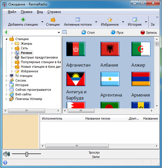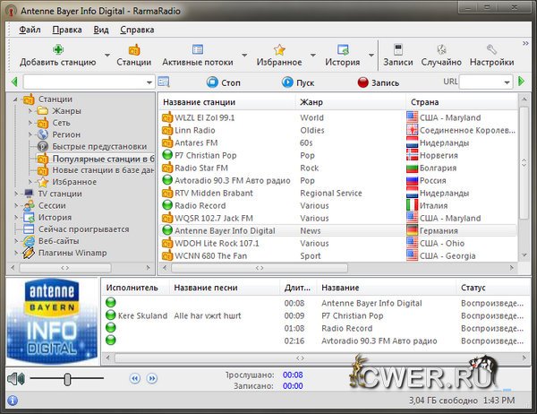 RarmaRadio - программа для прослушивания и записи интернет-радиостанций. Обладает большим набором возможностей, обеспечивая комфортное прослушивание радиостанций и удобную запись транслируемых данных. Программа содержит множество станций рассортированных на группы в зависимости от жанра музыки, битрейта, сети и региона, имеет функцию поиска станций, автоматически скачивает из Интернета информацию о проигрываемых песнях, включая альбомную графику, и поддерживает подключение плагинов медиаплеера Winamp. С помощью RarmaRadio можно слушая одну станцию, одновременно записывать несколько других интернет-радиостанций, осуществлять запись интернет-вещания по расписанию, а также автоматически начинать запись, в случае если заиграла определенная композиция. При сохранении полученных аудио файлов RarmaRadio добавляет в них теги.