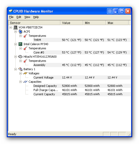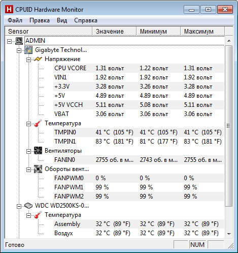 HWMonitor служит для мониторинга основных параметров состояния работы ПК, такие как напряжения, температуры, скорости вращения крыльчатки вентиляторов и т.д. Программа может обрабатывать показания практически всех внешних сенсоров, встроенных сенсоров CPU и т.д. Также поддерживается работа с технологиям Abit uGuru и Gigabyte ODIN.