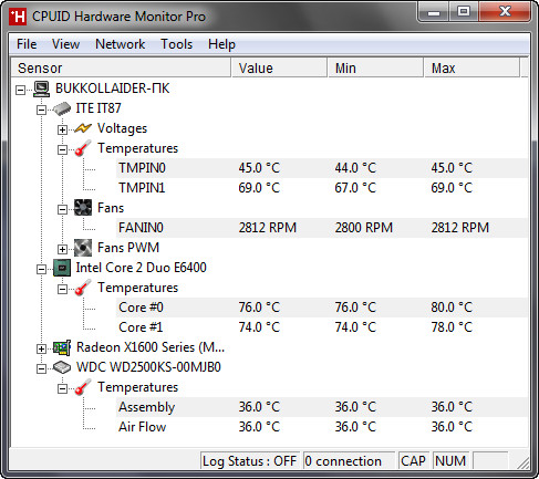 HWMonitor Pro - расширенная версия утилиты, разработанной для мониторинга показателей компонентов компьютера. В этот перечень входит температура, скорость вращения вентиляторов, а также напряжение. Приложение, которое можно бесплатно скачать на cwer.ws, поддерживает мониторинг процессорных датчиков, множества различных чипов мониторинга, abit uGuru 2003 и uGuru 2005, сенсоров блоков питания Gigabyte ODIN, S.M.A.R.T. показателей накопителей и видеокарт на базе GPU производства ATI и nVIDIA.