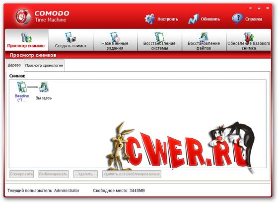 Comodo Time Machine - это бесплатная программа для отката системы, абсолютный аналог таких замечательных программ, как Roll Back RX и Eaz Fix. Программа поможет защитить ваш компьютер от сбоя, неправильно установленного драйвера, поражения любым вирусом, и вернуть обратно исправную систему за считанные минуты, не влияет на производительность и при этом позволяет без перезагрузки сделать автоматически или вручную менее чем за 3 секунды полный снимок системы, в любой из которых вы можете быстро вернуться или вернуть из них утерянные или разрушенные данные.