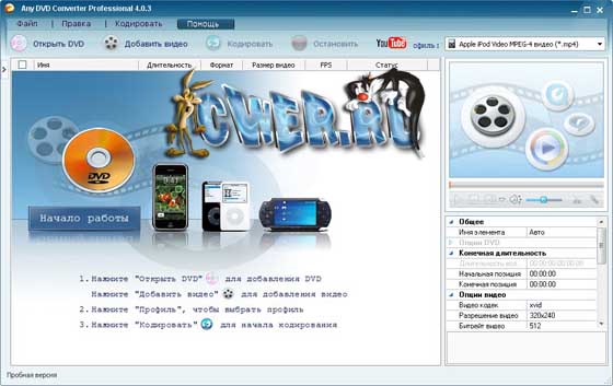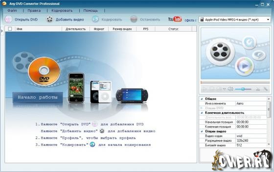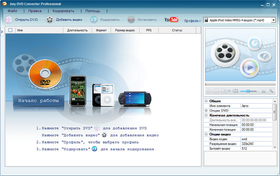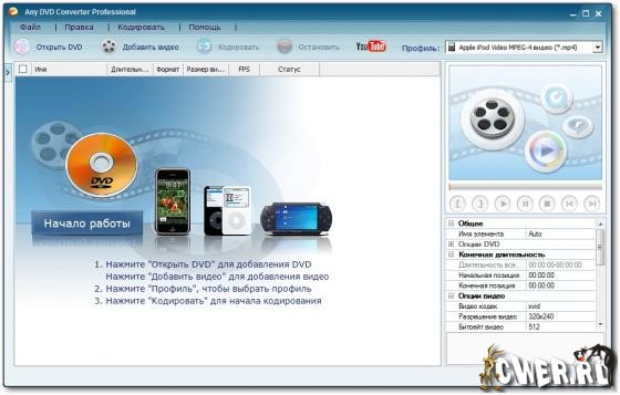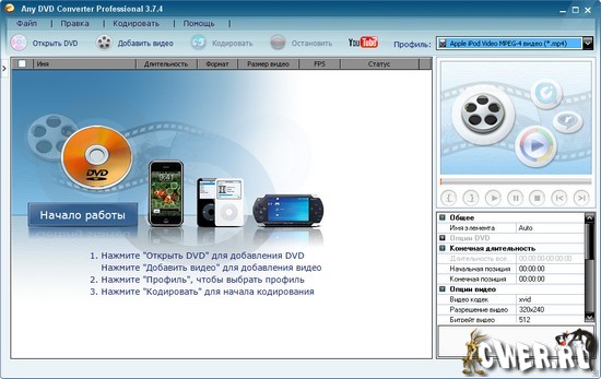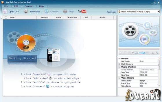 Отличный инструмент для конвертирования видео, с помощью которого можно конвертировать DVD в видео формат, поддерживаемый Apple iPod Movie и iPod Video (MP4) с быстрой скоростью конвертирования и превосходным качеством видео. Данный видео конвертер может преобразовать все типы видео файлов (avi, divx, xvid, flv, x264, vob, mpeg, DVD, YouTube, и т.д.) в надлежащие видео форматы (MPEG-4, H.264) для проигрывания на iPod.Также данным конвертером можно преобразовать видео для любого типа iPod, который проигрывает видео. Поддерживаются iPod, iPod touch, iPod nano и iPod classic в дополнение к 5-ому поколению iPod. Вы можете также преобразовать видео для iPhone.