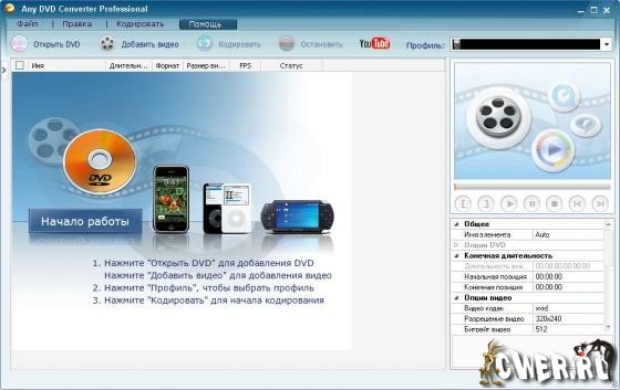 Any DVD Converter Pro – позволяет преобразовывать видео среди форматов AVI, MPEG, WMV, DivX, RM, MOV, 3GP, XviD, VOB и др. Помимо этого, программа обладает функцией риппера, которая позволяет копировать DVD-диски. Кроме того, Any DVD Converter Pro поддерживает пакетное преобразование файлов.