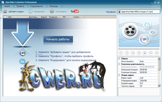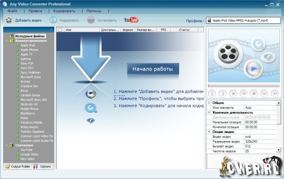 Any Video Converter Pro - это программа с графическим интерфейсом, быстрой скоростью и высоким качеством, позволяющее легко переводить видео в различные форматы. Данное средство позволяет вам без лишних усилий переводить видео файлы в любой формат! Программа может переводить практически все видео средства, включая DivX, XviD, MOV, rm, rmvb, MPEG, VOB, DVD, WMV, AVI в формат MPEG-4 для iPod/PSP или других портативных видео устройств, МР4 плейера или смартфона. Программа обладает невероятно быстрой скоростью и высоким качеством. Any Video Converter позволяет вам получать удовольствие от просмотра любого формата видео на вашем iPod, Zune, PSP, мобильном телефоне или МР4 плейере.