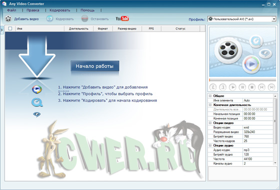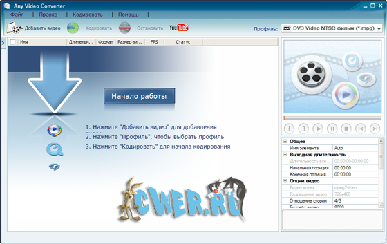 Программа для конвертирования видео файлов. Any Video Converter позволяет перекодировать популярные видео форматы (AVI, MOV, RM, MPEG, DVD, WMV, MP4 и FLV) в DVD, VCD, MP4 или FLV. В утилите присутствует возможность использовать для кодирования файлов как готовые профили с установленными параметрами видео, которые ориентированы на определенные устройства (бытовой DVD-проигрыватель, мобильный телефон), так и самостоятельно подбирать свои настройки конвертирования. Перед началом кодирования видео, его можно просмотреть во встроенном проигрывателе. В программе есть функция конвертирования только выбранного участка видео файла, для чего во встроенном плеере достаточно указать начало и конец нужного отрезка.