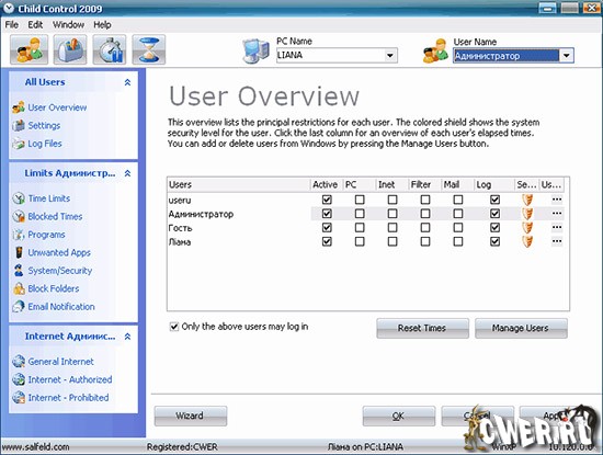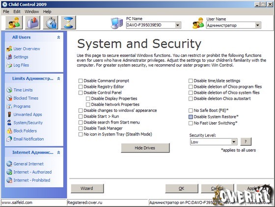 Child Control 2009 предназначена для родителей, желающих, чтобы их чадо меньше времени проводило за компьютером, а также для фильтрации открываемых в браузере интернет-страниц и контента. Есть возможность установки временного ограничения на работу компьютера или защиту паролем. Настройки программы довольно гибкие и осуществляются в несколько шагов.