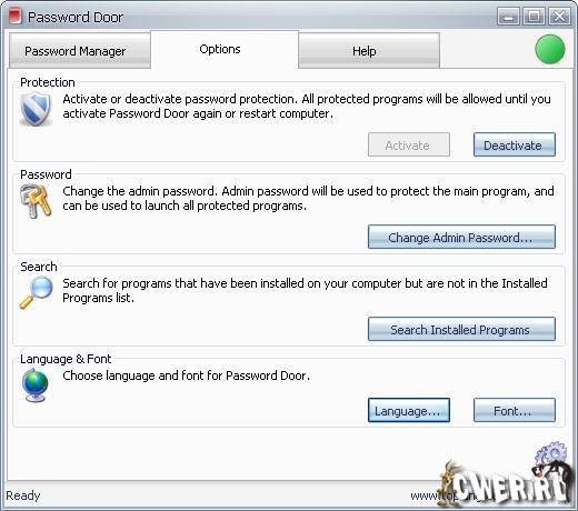 Password Door позволяет Вам запретить паролем запуск любой программы установленной на Вашем компьютере. При этом исключаються любые нарушения в работе софта или риск потери информации. Так же, поставленный Вами под защиту Password Door софт будет невозможно удалить без знания пароля. Да и прервать его защиту с помощью Windows's Task Manager'a тоже не удасться. Вообщем, вполне удобный и безопасный способ содержать данные и настройки своих программ в недоступном для шаловливых ручек Ваших коллег и домочадцев месте.