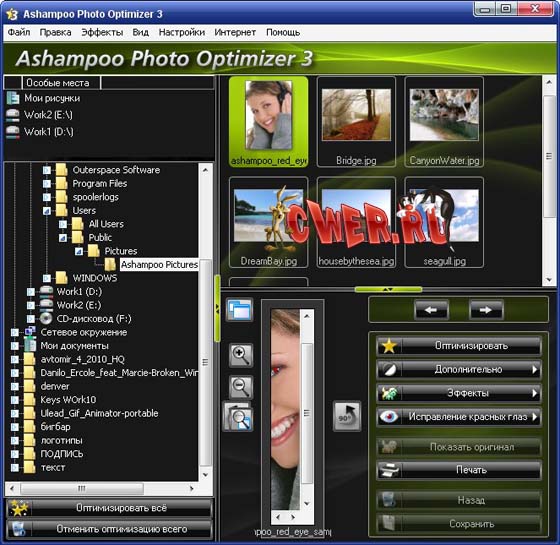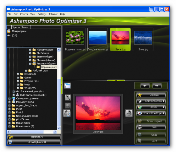 Ashampoo Photo Optimizer - простая в использовании программа для оптимизации и улучшения качества цифровых фотографий. Утилита позволяет корректировать контрастность, яркость и цветовой баланс. Все действия в программе производятся по нажатию необходимой кнопки на панели инструментов. Также, в данной программе предусмотрена пакетная обработка графических файлов. С помощью этой утилиты, снимки становятся ярче, светлее, приобретают четкость и контрастность. Если сравнивать показатели до и после преображения, заметно, насколько силен программный алгоритм оптимизации. Поработав однажды с этой программой, вы больше не захотите использовать другие.