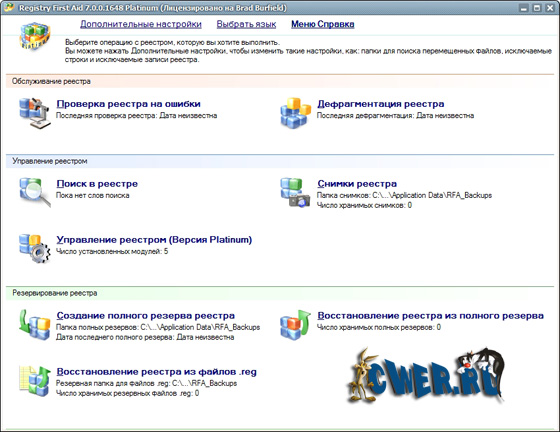 Registry First Aid Platinum - сканирует реестр на предмет испорченных или ненужных записей (оставшихся после удаления программ), тем самым обеспечивает более быструю работу компьютера и предотвращает сбои. Программа автоматически просматривает системный реестр и обнаруживает неверные ключи, которые вы сможете исправить или удалить. Также утилита производит поиск записей и сравнение их с файлами на диске, и, если найдена запись, соответствующая файлу, который был перемещен в другую папку, то программа скорректирует эту запись в реестре. Программа имеет опцию резервного копирования и восстановления реестра на случай, если система даст сбой, мультиязычный интерфейс, включая слабенький русский.