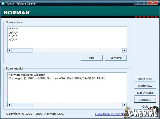 Norman Malware Cleaner - бесплатная утилита, которая после запуска сканирует ПК, обнаруживает и удаляет с компьютера различные виды вредоносного ПО. Программа способна завершать процессы инфицированных приложений, удаляет их из памяти, реестра и с диска, очищает host-файл, удаляет разрешения из брендмауэра Windows. Поддерживается очистка следующих вирусов: Agent, Bagle, Blaster, Dloader, Dumaru, Feebs, JS/Small, Lovgate, Mitglied, Mydoom, Mytob, Navipromo, Netsky, Newdotnet, Renos, Sasser, Sdbot, Sircam, Small.KI, Sober, Sobig, Spyaxe, Spybot, Spywad, Startpage, Swen, Yaha, Zafi, Zlob, Zotob и др.