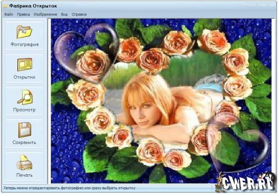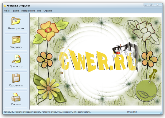 Фабрика Открыток - программа для создания стильных поздравительных открыток с вашими фотографиями. Позволяет всего за пару минут получить готовую открытку профессионального качества. Красивый, удобный интерфейс и богатые возможности оформления фотографий открывают новые перспективы для вашего творчества.