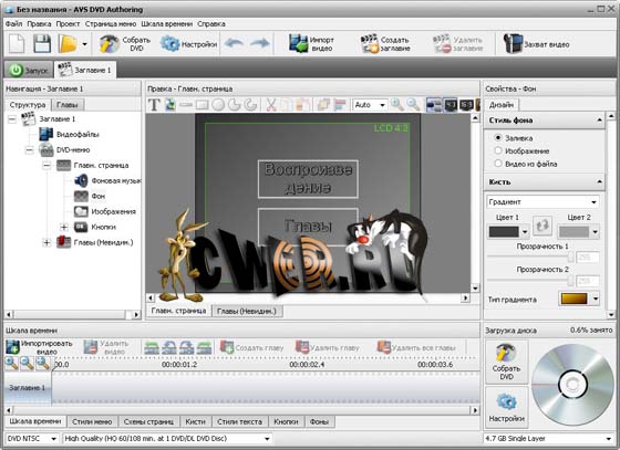 DVDStyler - программа для создания DVD видео дисков. DVDStyler может использоваться как профессионалами, так и новичками для проектирования, создания и записи DVD видео дисков с интерактивным меню. Как и в других подобных программах, в DVDStyler имеется окно для размещения и просмотра всех добавленных в проект элементов (меню и фильмы) и инструмент для создания меню будущего DVD диска.