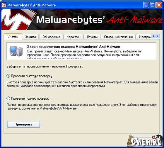 Malwarebytes Anti-Malware - программа для быстрого сканирования системы с целью обнаружения и удаления различных видов вредоносного ПО. Malwarebytes Anti-Malware ориентирована в первую очередь на борьбу со шпионскими модулями и позволяет после их удаления полностью восстанавливать нормальную работу компьютера.