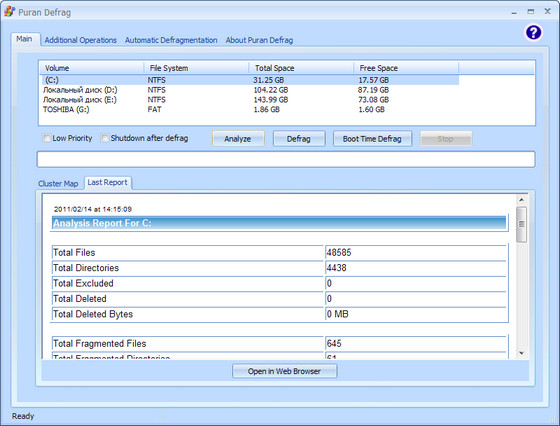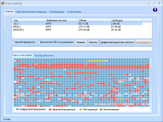 Puran Defrag - это высокоскоростной дефрагментатор, обладающий необычайно простым и удобным интерфейсом, а также некоторыми необычными функциями. Необычность включает в себя не только непривычно удобный интерфейс, но и сама технология дефрагментации, которая заключается, как в полной дефрагментации дисков, или отдельных ее файлов из простого контекстного меню, так и размещение часто употребляемых файлов в область более быстрого доступа, что как и понятно, существенно увеличивает производительность. Даже если для полной дефрагментации файла не хватает места, программа использует все имеющиеся ресурсы и дефрагментирует файл, насколько это возможно. Данный дефрагментатор идеально подойдет для тех пользователей, кому некогда, а обслуживать систему все равно надо. Имеет очень простой интерфейс, который не вызовет каких-либо проблем при использовании данной программы.