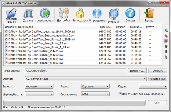 Allok AVI MPEG Converter - все что нужно для конвертирования видео среди форматов AVI, DivX, MPEG, VCD, SVCD, DVD, WMV и ASF. Быстрый встроенный MPEG-кодек позволит вам создавать файлы DVD-Video (VIDEO_TS, AUDIO_TS) и образы VCD/SVCD (*.bin,*.cue), так что вы легко сможете прожечь VCD/SVCD/DVD диски с помощью сторонних программ. Также имеется поддержка форматов 4:3 и 16:9, изменение качества выходного видео, все кодеки встроены в программу. Дружественный интерфейс поможет вам легко и быстро использовать программу.