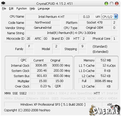 Выдает информацию об установленном в компьютере процессоре, чипсете, RAM, BIOS и устройствах PCI, причем полученные сведения можно сохранить в виде текстового или графического файла. Кроме этого, на AMD K6/K7/K8 позволяет менять множители напряжений. Поддерживаются как 32-, так и 64-битные процессоры (AMD64/EM64T). Работает без инсталляции.