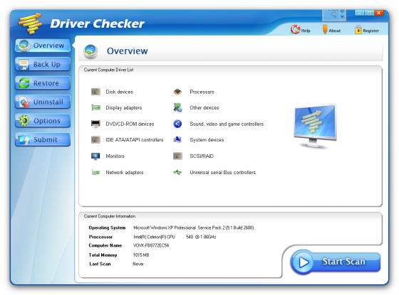 Driver Checker - менеджер драйверов который не только обнаружит и "вытащит" драйвера из системы для их возвращения на место после переустановки системы, но и обновит их на более свежие, из большой базы данных оригинальных драйверов от производителей. Поддерживает и автоматически обновляет драйвера: принтеров и сканеров, USB, звука, Vista, Bluetooth, мыши и клавиатуры, Видео, RAID, модемов и сетевых карт, веб-камер, графических карт, VGA и других Windows-драйверов.