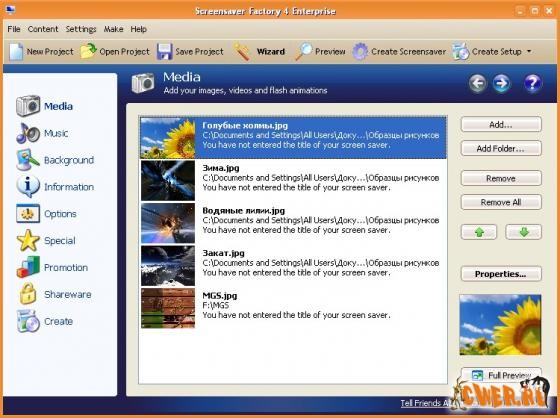 Screensaver Factory Enterprise - приложение для создания экранных заставок из неограниченного набора изображений, звуков, видео и флэш-анимации. Программа дает возможность применять более ста эффектов перехода и сглаживания и многое другое. Она проста в использовании и позволяет самостоятельно создавать установочные файлы экранных заставок для их дальнейшего использования. Скачав утилиту на cwer.ws, вы сможете создавать платные экранные заставки, предназначенные для продажи, используя специальные функции программы - установка регистрационных ключей, ограничения по времени или использованию, использование лицензионных соглашений и т.д. Программа обладает удобным пользовательским интерфейсом, не вызывающим вопросов при использовании программы.