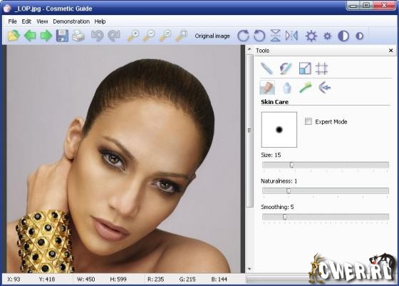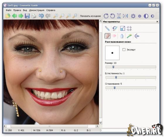 Cosmetic Guide - программа для удаления косметических дефектов непосредственно на фотографиях. Поможет разгладить морщины, отеки или припухлости; удалить родимые пятна и бородавки; избавиться от второго подбородка; отбелить зубы. В программе есть демонстрационные примеры, показывающие работу с инструментами.