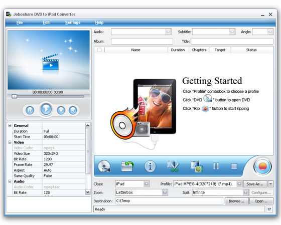 Joboshare DVD to iPad Converter - магический конвертор DVD для вашего IPad! С Joboshare DVD to iPad Converter, вы можете копировать и конвертировать DVD фильмы в iPad MPEG-4, H.264 видео форматы с различным разрешением (1280*720, 720*480, 640*480) и MP3, AAC и M4A аудио форматы с превосходным качеством. Все преобразования оптимизированы, чтобы предложить вам наилучшие ощущения от просмотра фильмов DVD на вашем IPAD.