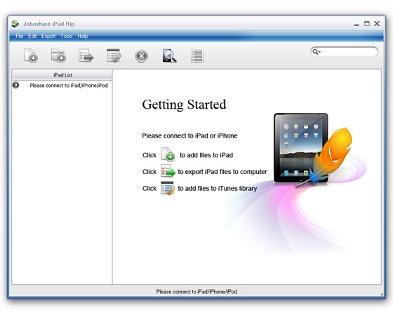 Joboshare iPad Rip - теперь вы можете легко передавать мультимедийные файлы с компьютера на IPad без ограничений! Кроме того, поддерживает и работает как iTunes, Joboshare iPad Rip также позволяет считывать, копировать, или резервировать IPad музыку, кино, фото, EPUB, PDF, аудиокниги, подкасты и телешоу на компьютер. Вы даже можете просто получить синхронизацию IPad библиотек, как музыку, кино, EPUB, PDF, аудиокниги, подкасты и TV Show файлы на ITunes.