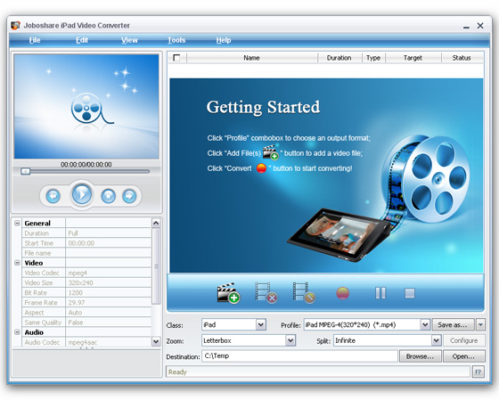 Joboshare iPad Video Converter - позволяет преобразовывать все популярные видео форматы, такие как AVI, MPEG, WMV, DivX, MKV, MOV, RM, VOB, и аудио форматы, такие как M4A, AAC, WAV, WMA, MP2, AC3 и РА в IPad MPEG-4, H.264/MPEG-4 AVC видео и MP3, M4A, AAC аудио форматы для проигрывания их на IPAD. Теперь можно делиться любимыми фильмами, музыкой и коллекцией фотографий на новейших IPad!