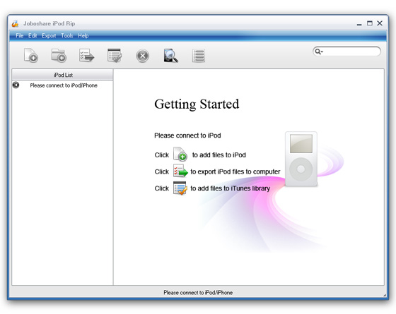 Joboshare iPod Rip - легкий в использовании IPod риппер, программа для резервного копирования с IPod, для переноса с IPod, которая может быстро считывать, копировать и передавать вашу музыку, кино, фото, EPUB, PDF, аудиокниги, голосовые заметки, с камеры (IOS 4 и выше), подкаст и ТВ-шоу с IPod на компьютер и наоборот, даже без ITunes. Все форматы, совместимые с IPod поддерживаются. Кроме того, Joboshare iPod Rip позволяет создавать, редактировать и удалять IPod плейлисты. С профессиональным IPod риппером, вы можете копировать файлы между несколькими iPods (IPod в IPod) в одно время.