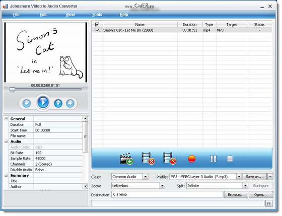 Joboshare Video to Audio Converter - мощный видео в аудио конвертер и аудио конвертер, который может конвертировать MP4 в MP3, MPEG в MP3, AVI в MP3, WMV в MP3 и т.д. Данный конвертер может конвертировать различные форматы, включая MPEG1, MPEG2, MPEG4, WMV, AVI, MP4, 3GPP, 3G2, MOV, RM, RMVB, OGG, DV, H.264/AVC в популярные аудио форматы, такие как MP3, WAV , AC3, WMA, M4A, OGG, AAC и т.д. Преобразованные аудио файлы могут быть воспроизведены на различных аудио проигрывателях, таких как IPod Shuffle, IPod Nano, IPod Classic, Ipod Touch, Zune и различных mp3-плеерах.