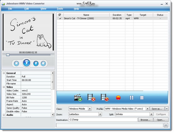 Joboshare WMV Video Converter - является мощной программой для конвертации видео и аудио файлов в WMV формат. Она поддерживает преобразование большинства видео форматов, включая DVD, VCD, AVI, WMV, MP4, MOV, 3GP, анимированный GIF, RM, ASF и аудио форматы файлов такие, как MP3, WMA, OGG, AAC, M4A, WAV, AC3 и так далее. Более того, программа поддерживает настройку параметров аудио / видео кодеков и функции редактирования ID3-тегов, и аудио форматов, таких как WMA и MP3. С ее помощью вы можете также извлекать и конвертировать аудио из видео файла.