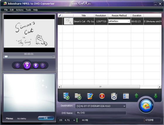 Joboshare MPEG to DVD Converter - программа для создания полноценных видео DVD проектов с прожигом (записью) на DVD носитель. С ее помощью можно легко преобразовать и записывать все популярные видео MPEG файлы, такие как MPEG-1, MPEG-2, MPEG-4, MP4, M2V, MP4, MPG , DAT, VOB на DVD для воспроизведения на домашнем проигрывателе DVD. Вы можете записать ваш DVD, указав битрейд, фреймрейд, кодировку NTSC или PAL, настроить соотношение картинки 4:3 или 16:9, создать меню и субтитры из нескольких десятков блестящих шаблонов для DVD меню, установить фоновую музыку и изображения.