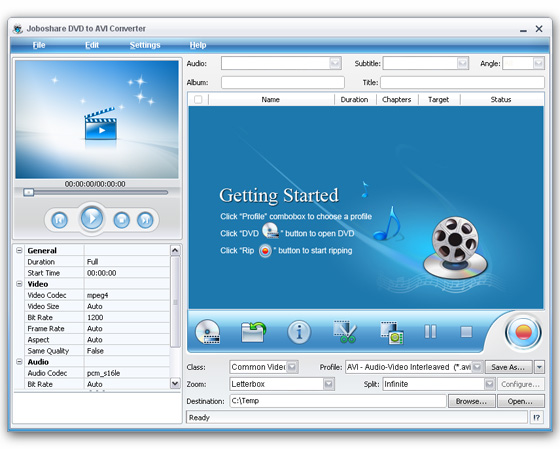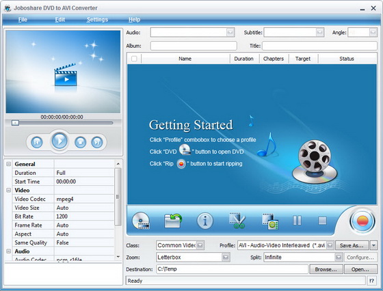 Joboshare DVD to AVI Converter - мощный и простой в использовании DVD в AVI, DVD в XviD, DVD в DivX конвертор, может произвести рип и преобразовать DVD в AVI, DivX, XviD, MPEG-1, MPEG-2 видео форматы с супер быстрой скоростью преобразования и отличным качеством.