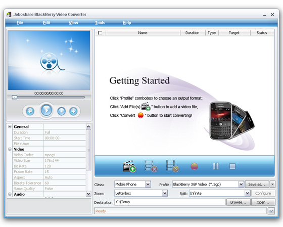 Joboshare BlackBerry Video Converter - является очень мощным и простым в использовании BlackBerry видео конвертором. Вы можете легко и быстро конвертировать все популярные видео форматы, такие как AVI, MPEG, WMV, MOV, MP4, RM, DivX, ASF, VOB, 3GP и так далее, в BlackBerry видео формат AVI, 3GP, MP4, WMV.