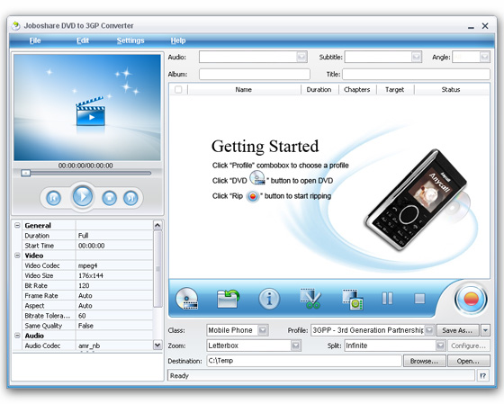 Joboshare DVD to 3GP Converter - мощный DVD в 3GP конвертор, может быстро преобразовать DVD в 3GP, 3G2, MP4, MOV, AVI видео форматы и конвертировать DVD в MP3, WAV, M4A, AAC аудио форматы для воспроизведения на популярных мобильных телефонах, таких как Motorola, Nokia, Samsung, BlackBerry, Sony Ericsson, LG и другие.