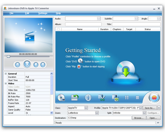 Joboshare DVD to Apple TV Converter - является мощным и простым в использовании DVD в Apple TV конвертором, который может помочь вам преобразовать DVD в Apple TV H.264/MPEG-4 AVC (480p, 720p), MP4, FLV видео с супер высокой скоростью и отличным качеством изображения и звука. DVD в Apple TV конвертер также поддерживает копирование и конвертирование DVD в Apple TV аудио, MP3, WAV, и AAC.