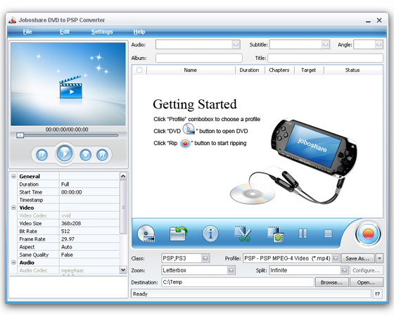 Joboshare DVD to PSP Converter - мощный конвертор DVD для PSP, может конвертировать DVD в PSP видео MP4, PSP H.264/MPEG-4 AVC видео и переместить преобразованный файл на PSP. Профессиональный DVD для PSP конвертор, может также конвертировать DVD в PSP MP3 и M4A аудио с превосходным качеством.