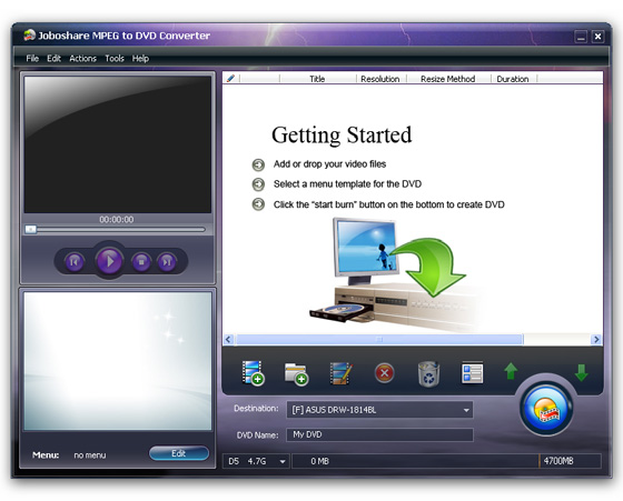 Joboshare MPEG to DVD Converter - программа для создания полноценных видео DVD проектов с прожигом (записью) на DVD носитель. С ее помощью можно легко преобразовать и записывать все популярные видео MPEG файлы, такие как MPEG-1, MPEG-2, MPEG-4, MP4, M2V, MP4, MPG , DAT, VOB на DVD для воспроизведения на домашнем проигрывателе DVD. Вы можете записать ваш DVD, указав битрейд, фреймрейд, кодировку NTSC или PAL, настроить соотношение картинки 4:3 или 16:9, создать меню и субтитры из нескольких десятков блестящих шаблонов для DVD меню, установить фоновую музыку и изображения.
