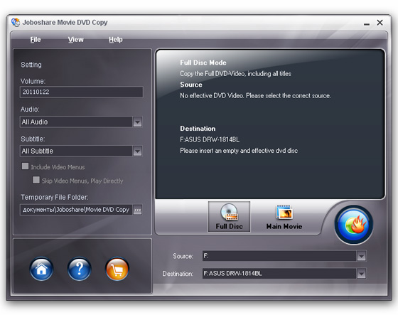 Joboshare Movie DVD Copy - программа для быстрого копирования фильмов DVD, резервного копирования ваших D9 и D5 DVD коллекций фильмов на чистые диски DVD (D9 в D9 и D5 в D5) с легкостью. Поддерживает копирование DVD фильмов 1:1, вы можете легко получить точные копии DVD фильмов. Кроме того, можно сжимать DVD-9 (двухслойный DVD) и записать на один DVD-5 диск.