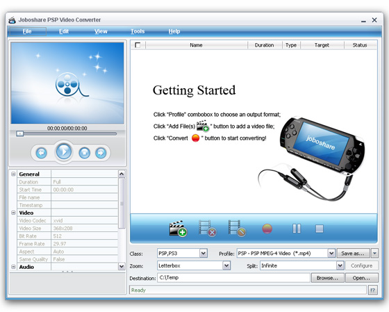 Joboshare PSP Video Converter - является лучшим конвертором PSP и PSP Movie конвертором, предназначен для пользователей, которые хотят конвертировать видео для Sony PSP и наслаждаться преобразованными файлами на Sony PSP. Конвертор PSP может конвертировать видео для PSP Movie, так и PSP MP4, PSP видео H.264/AVC, PS3 Video MPEG-4 (480p, 720p, 1080i) и извлекать аудио из видео в PSP MP3 и M4A.