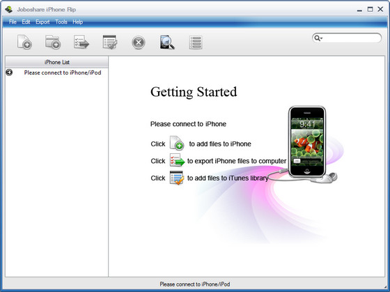 Joboshare iPhone Rip - программа для обмена аудио и видео файлами между компьютером и Apple iPhone проигрывателем, передача аудио и видео файлов с компьютера в iPod или iPhone, передача аудио или видео файлов с iPod или iPhone на компьютер, поддержка iTunes, поддержка Video iPod, iPod Nano, iPod Mini, iPod 4G, iPod Nano 3, iPod Classic, iPod Touch, поддержка AAC, MP3, AIF, M4A, M4V, MP4, MOV, WAV форматов, создание и редактирование плейлистов.