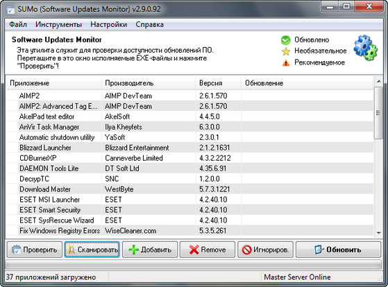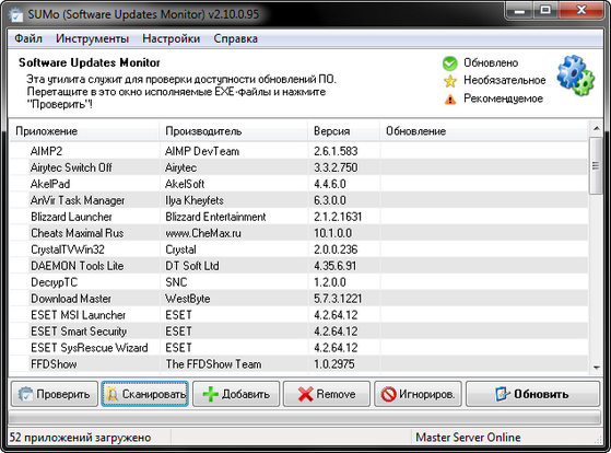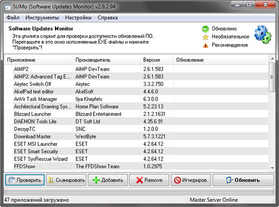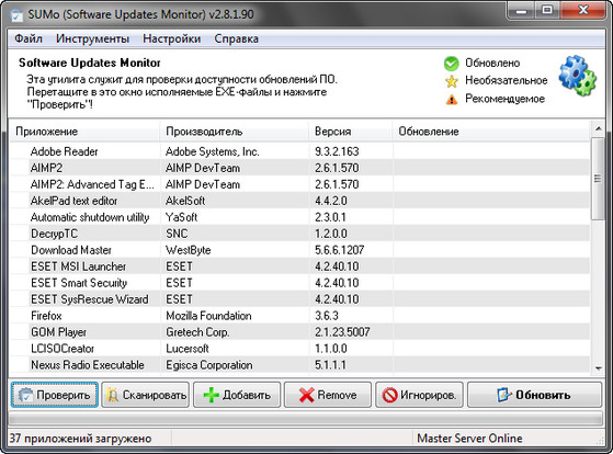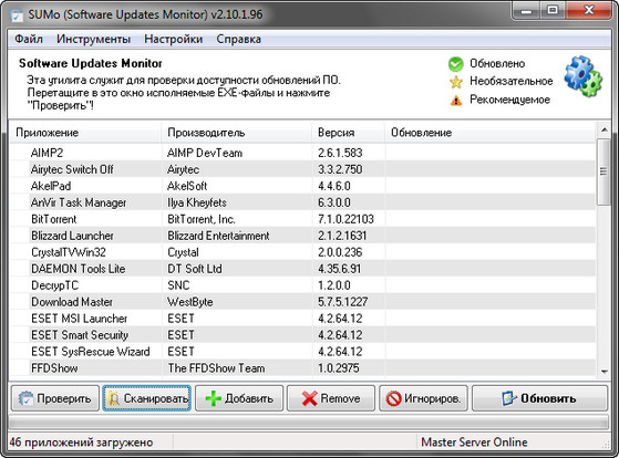 SUMo - утилита для отслеживания обновлений программного обеспечения, установленного на компьютере пользователя. Главная задача SUMo - уведомление о появлении новых версий приложений, с которыми вы работаете. Для проверки наличия обновления к той или иной программе, достаточно перетащить исполняемый файл программы в окно SUMo. В этом окне можно увидеть название приложения, номер версии, название компании-разработчика и информацию о наличии обновлений. SUMo удобна тем, что позволяет проверить наличие обновлений, не открывая при этом сами программы. С помощью SUMo можно проверять апдейты сразу для нескольких приложений, а затем выборочно загружать их.