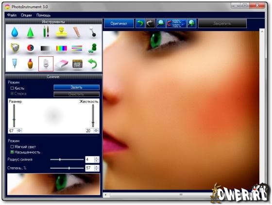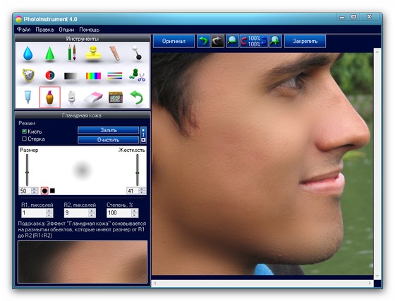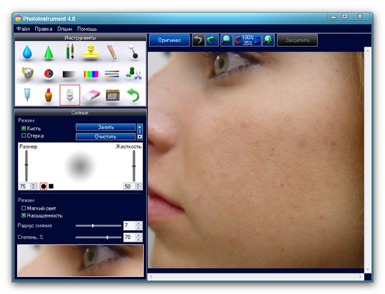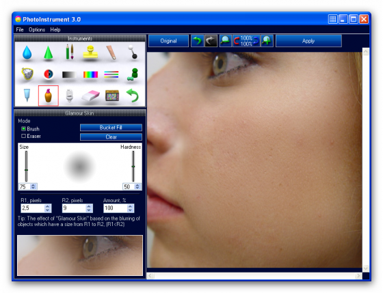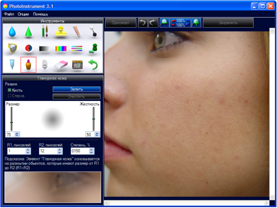 PhotoInstrument - легкий редактор для обработки портретов цифровых фотографий. От Очистителя кожи до придания ему гламурного вида "глянцевых журналов", попутно включая инструменты для: ретуширования, удаления красных глаз, сглаживания морщин, увеличения чёткости, коррекции цвета и многого чего еще, для приданию портрету совершенного вида и желаемой привлекательности.